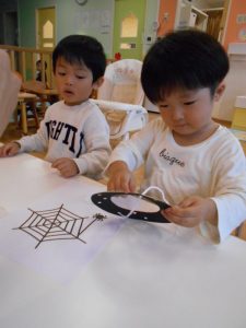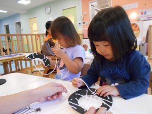 穴の開いた紙皿に毛糸を通してクモの巣を作りました。