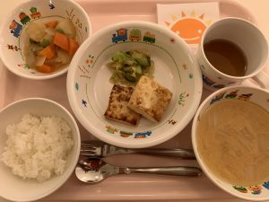 軟飯 味噌汁 豆腐の照り焼き おかか和え 含め煮