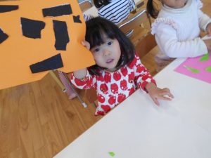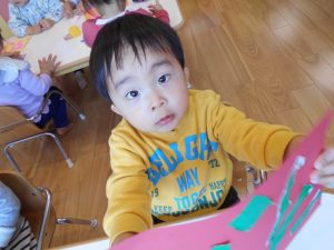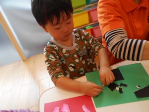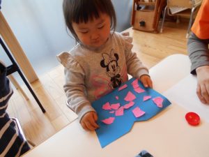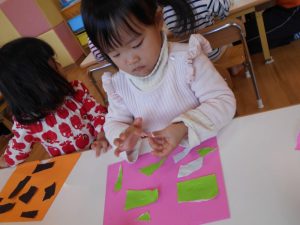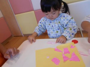 好きな色の折り紙をビリビリと夢中でちぎり…