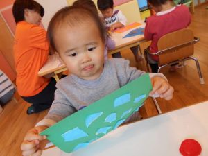 いちごぐみ☆りんごぐみは、ちぎった折り紙をパンツ型の画用紙に貼りました♪