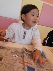 新聞紙でつくった豆をオニの的に力いっぱい投げました!!