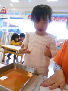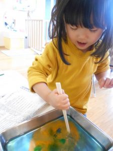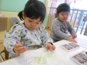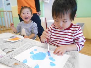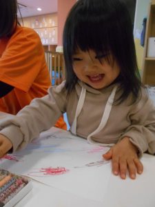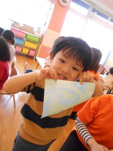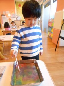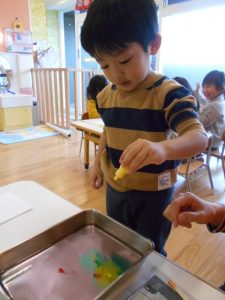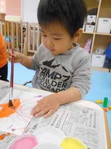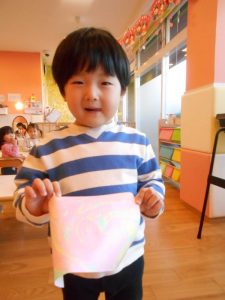 ☆クレヨンで描いた絵に好きな色の絵の具を塗ります。