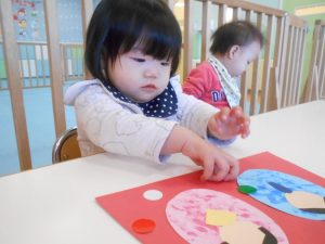 雛人形の着物にフィンガーペインティングで模様をつけて、周りにシールを貼って飾り付けました♪