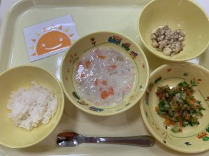 粥 鶏ひき肉シチュー きゅうりとにんじんのおかか和え バナナ