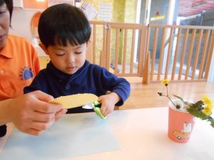 ☆はさみで画用紙を切って花びらをつくります♪