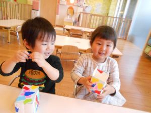 ☆牛乳パックに好きな色の折り紙を貼ります。
