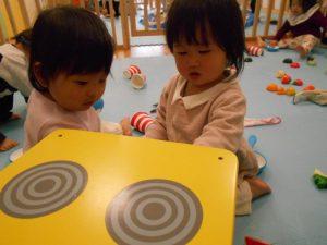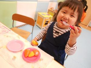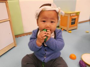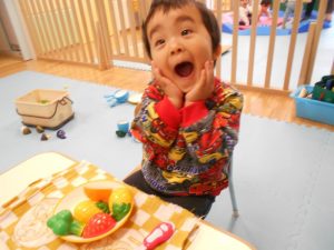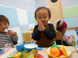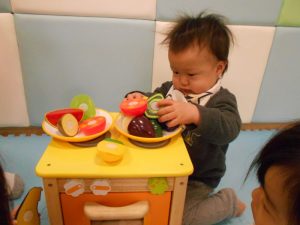 食べ物のおもちゃやキッチンのおもちゃで夢中になって遊んでいます♪