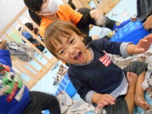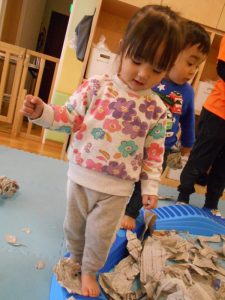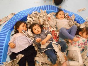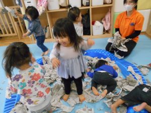 みんなでたくさん新聞をちぎると…新聞紙お風呂の完成です!!
