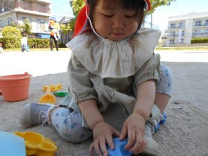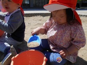 砂あそびでは、スコップが大人気!砂をすくってはバケツの中に入れています♪