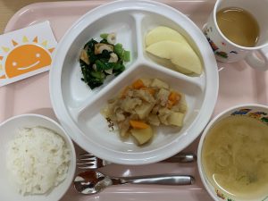 粥 味噌汁 じゃが芋煮 青菜の煮浸し りんごすりおろし