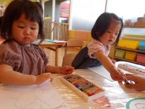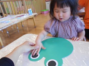 カエルさんのお腹にクレヨンでお絵描き![]()