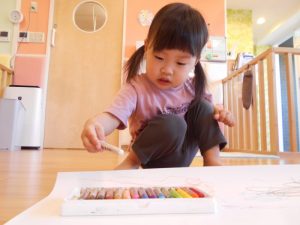 お絵描きの前に うた「どんな色が好き」を歌って色の紹介と 絵本「クレヨンのくろくん」を読んでお絵描きの楽しさ伝えました![]()