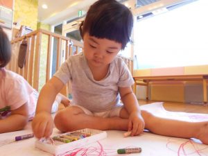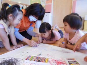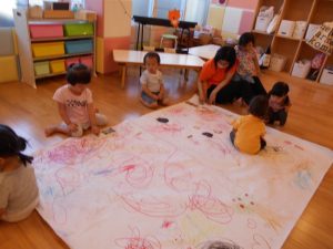 大きな真っ白な紙に書きはじめる子どもたちは…「何色で描こうかな⁇」「どこに描こうかな⁇」と考えながらニコニコ嬉しそうでした![]()