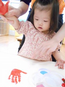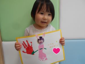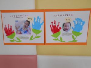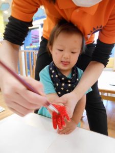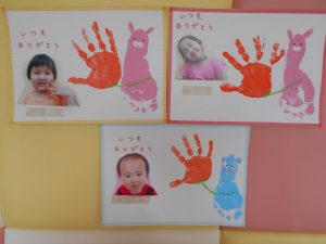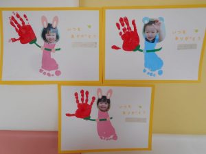 子どもたちに「大好きなお家の人へプレゼントしようね♡」とお話しながら手形、足型をとりました![]()