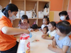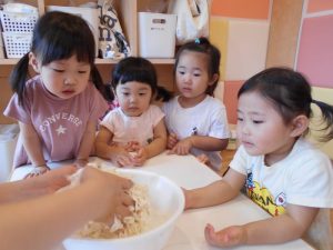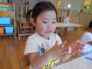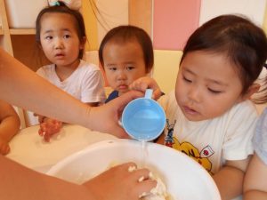 子どもたちにお手伝いしてもらいながら、小麦粉ねんどを作りました♪