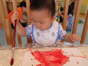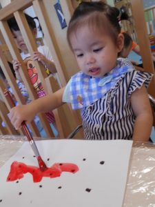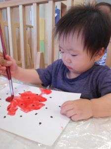 筆渡すと…ギュッと握ってトントン~♪とリズムカルに色を付けたり、スイスーイ♪と筆を動かして描き心地を楽しんでいました![]()