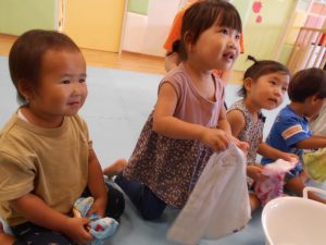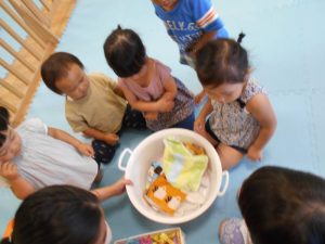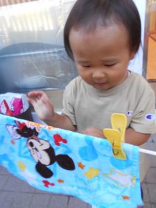 絵本が終わり、保育士が「今日はお洗濯するよ!」と伝えると…「やりたーい!!」とやる気満々にお返事が返ってきました![]()