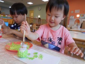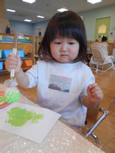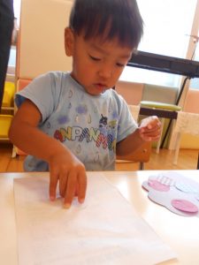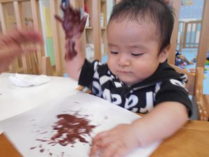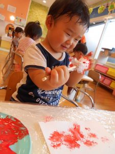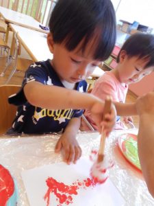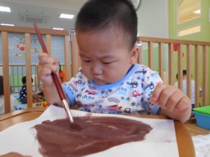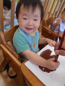 筆をギュッと握って画用紙にあてると…色が付いた!と驚きながらも夢中になって筆を動かしていました