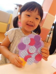 好きな模様の折り紙を選んで、画用紙に糊で貼りました。