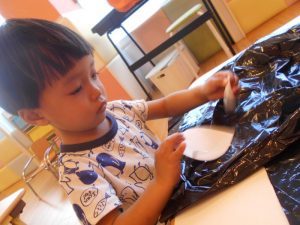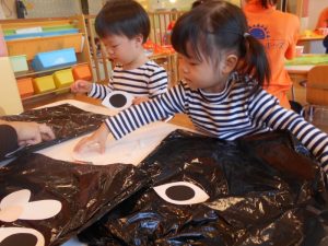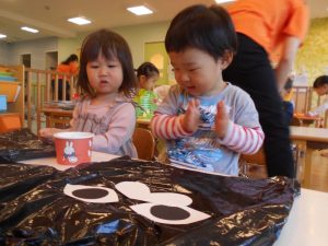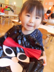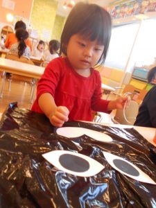 いちごぐみさんに「黒猫さん作ろうね♪」と伝えると、「ねこ⁇にゃんにゃん⁇」と黒いポリ袋を触って不思議そうにでしたが…目を1つ、目を2つ貼っていくうちに「っあ!ねこだ!」ときづいていき「ねこねこ~♪」と嬉しそうに教えてくれました