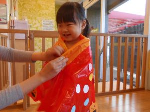 子どもたちが好きな色のマントを選び飾り付けました♪