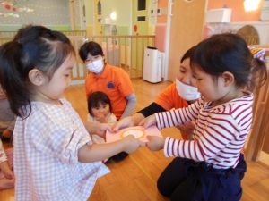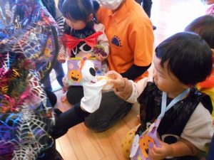 ドキドキした様子の子どもたちでしたが…お菓子をもらうとニッコリ笑顔になりました![]()