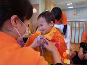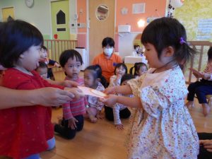 「今月のお誕生日のお友だちは~!!」名前を呼ばれると、元気よくお返事して前に出て来てくれました♪