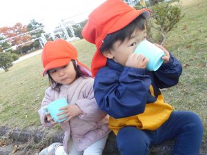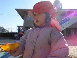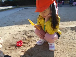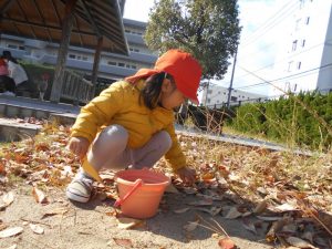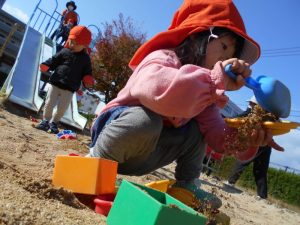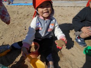 砂場では、砂とどんぐりを混ぜたり、どんぐりケーキを作ったりと想像力を膨らませて遊んでいました♪
