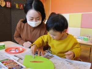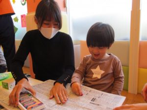 画用紙にクレヨンお絵描きして、ポンポンなどをつけてデコレーションしました