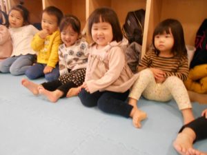 ひとりでトイレに行った子ぶたちゃん♪はじめは片足入れて、それからもう片方と…パンツをはくまでのお話です。サンライズキッズは、パンツをはく子こぶたちゃんに興味津々な様子で「うん!うん!そうそう!」と応援しているようでした![]()