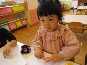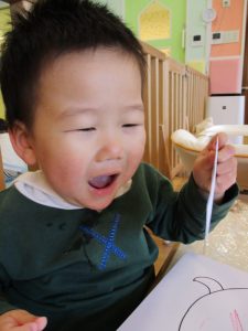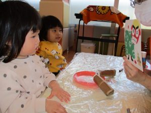 いちごぐみさんに「獅子舞作るよ♪」と伝えると…「ししまい⁇なあに?」と不思議そうに見ていましたが、完成して保育室に飾ると「ししまい!ししまい」と言って嬉しそうに眺める姿もありました![]()