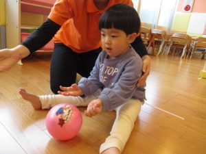 今月の体操では、ボールを転がして鬼のゴールに入れて遊びました![]()