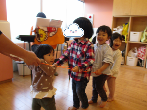 今月のリトミックでは、うた『線路は続くよどこまでも』に合わせて電車ごっこを楽しみました♪列車に入ると…ドキドキ