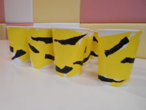 紙コップに黄色と黒の折り紙を貼って、オニのパンツ模様の升を作りました!