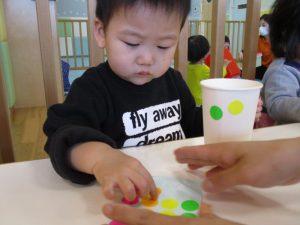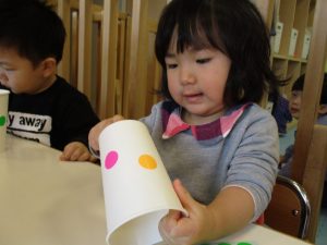カラーシールを紙コップにたくさん貼りました♪