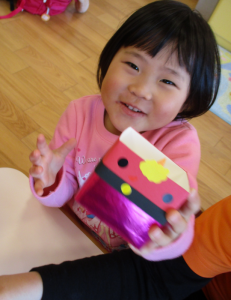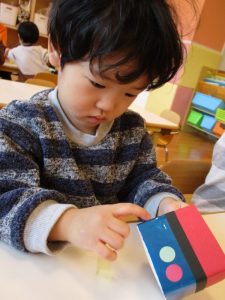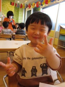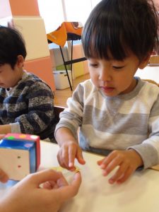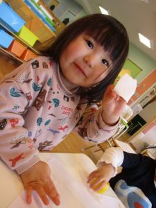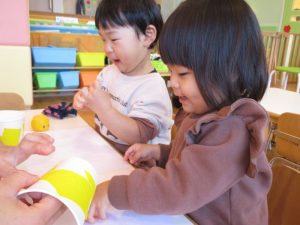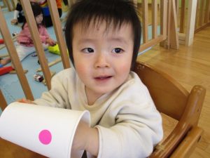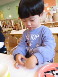 升にシールを貼って鬼の顔を作ると「鬼だね~♪」とお友だちと見せ合いっこして、完成を一緒に喜んでいました![]()