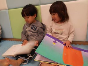 本棚から好きな絵本を選ぶと、すぐには読まず…絵本を後ろに置く子どもたち♪