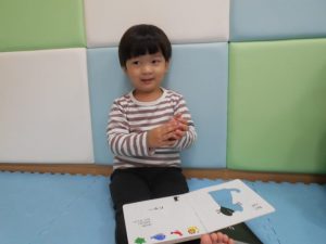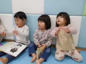 何してるのかな⁇と見ていると…手遊びからはじまって、大きな声で絵本を読みはじめました![]()