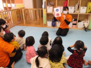 ☆まず、絵カードを見ながら、子どもたちに節分についてお話しました。