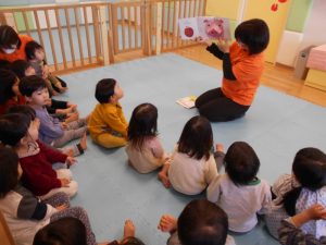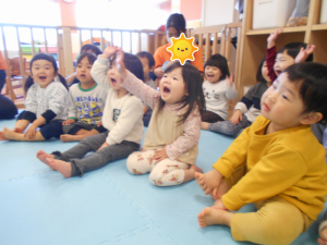 サンライズキッズは「食べるのだあれ?」の後は、動物たちと一緒に「はーい!!」と手をあげて楽しそうに絵本を見ていました![]()