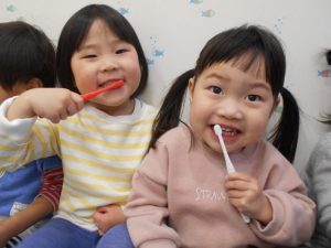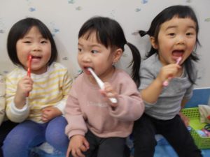 「奥歯だよ!」と教えてくれたり「綺麗になった⁇」と歯を見せ合ったりとみんなで楽しく歯みがきをしています![]()