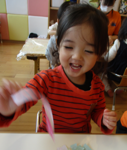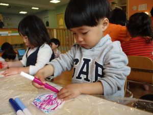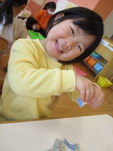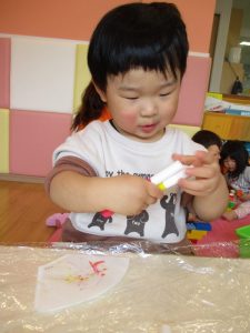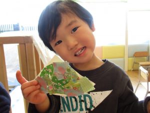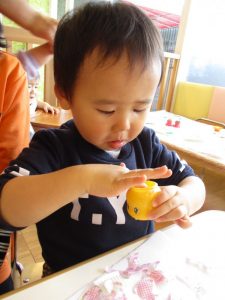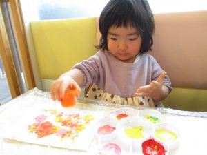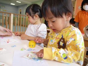 スタンプを押すとお花やちょうちょが出てくるのを不思議そうに見ながら夢中になってスタンプを押していました♪