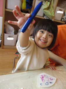 ペンを持つと…トントン♪とリズミカルに点々模様を付けたり、グルグル線をたくさん描いたりとペンの描き心地を楽しんでいました![]()