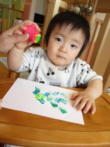 お花のスタンプを押しながら「お花が咲いたね!!」とお話すると手をパチパチ叩いて喜ぶももぐみさん![]()