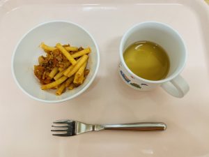 ※おやつのマカロニミートは、マカロニを少しやわらかく茹でて食べやすくしました。ボリュームもあり、腹持ちの良いおやつです。