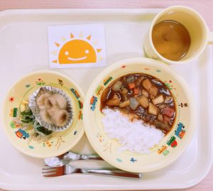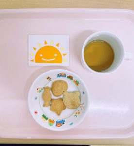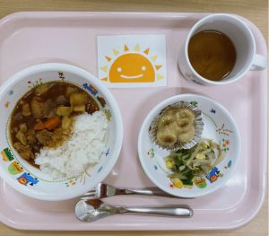 ※給食ができあがると、「いいにおい、なんのごはんだろうね~」とかわいい声が聞こえてきました。においを感じるのも五感の発達につながります♪