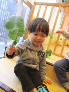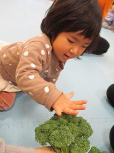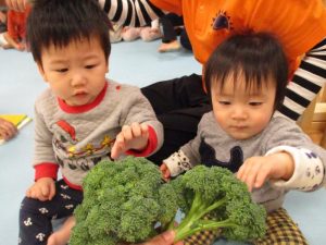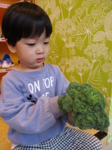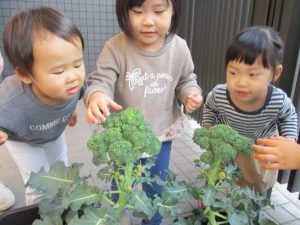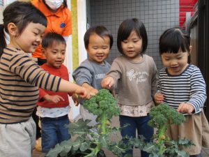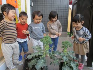苗の時は、「ブロッコリーになるのかな⁇」と実感が湧かない子どもたちでしたが、真っ直ぐ伸びた たくましいブロッコリーができているのを見て「ブロッコリーだ!!」「すごーい」と大喜びでした