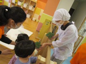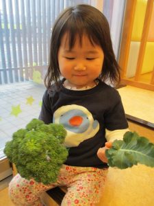 給食の先生のところへ行き「ブロッコリーおいしく茹でてください♪」とお願いしました
