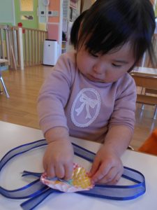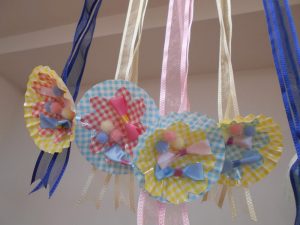 おかずカップに、リボンやポンポンの飾りを付けます![]()