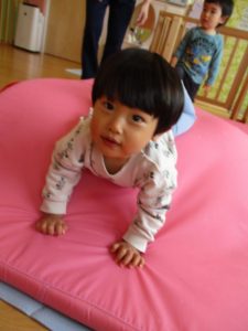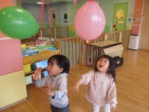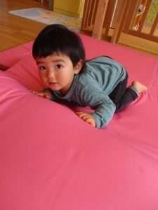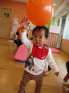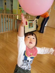 トンネルをくぐったり、天井から吊るした風船をタッチしたり、風船マットの山をハイハイで進んだり、部屋の中でも活発的です![]()